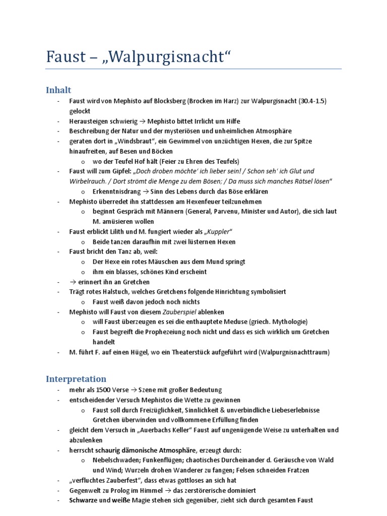 Goethe faust walpurgisnacht zusammenfassung. Nach der gemeinsamen Liebesnacht ist Margarete schwanger und Heinrich Faust ber alle Berge. Dieser Trank soll auerdem bewirken das sich Faust in die erste Frau die er sieht verlieben soll.